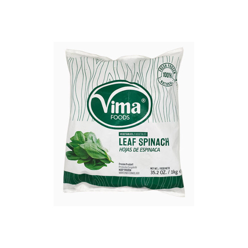 Espinacas Vima en bolsa de 1kg, congeladas y escaldadas, listas para usar en una amplia variedad de recetas. Producto de alta calidad, recolectado en su punto óptimo de maduración y conservado mediante congelación IQF (Individual Quick Freezing), lo que garantiza frescura, sabor y valor nutricional durante todo el año.
