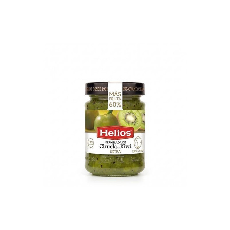 Mermelada extra de ciruela y kiwi HELIOS de 340 gramos, elaborada con alta concentración de fruta y sin conservantes, perfecta para untar en tostadas o rellenar pasteles.
