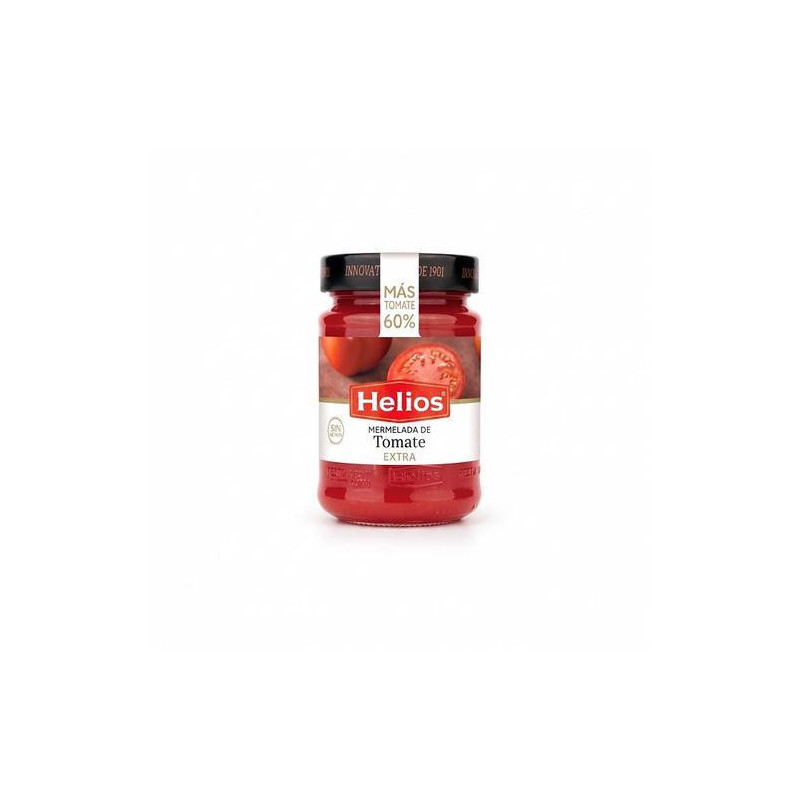 Mermelada extra de tomate HELIOS de 340 gramos, elaborada con una alta concentración de tomate maduro y sin conservantes artificiales, ideal para untar, acompañar quesos curados o dar un toque agridulce a carnes y tapas.