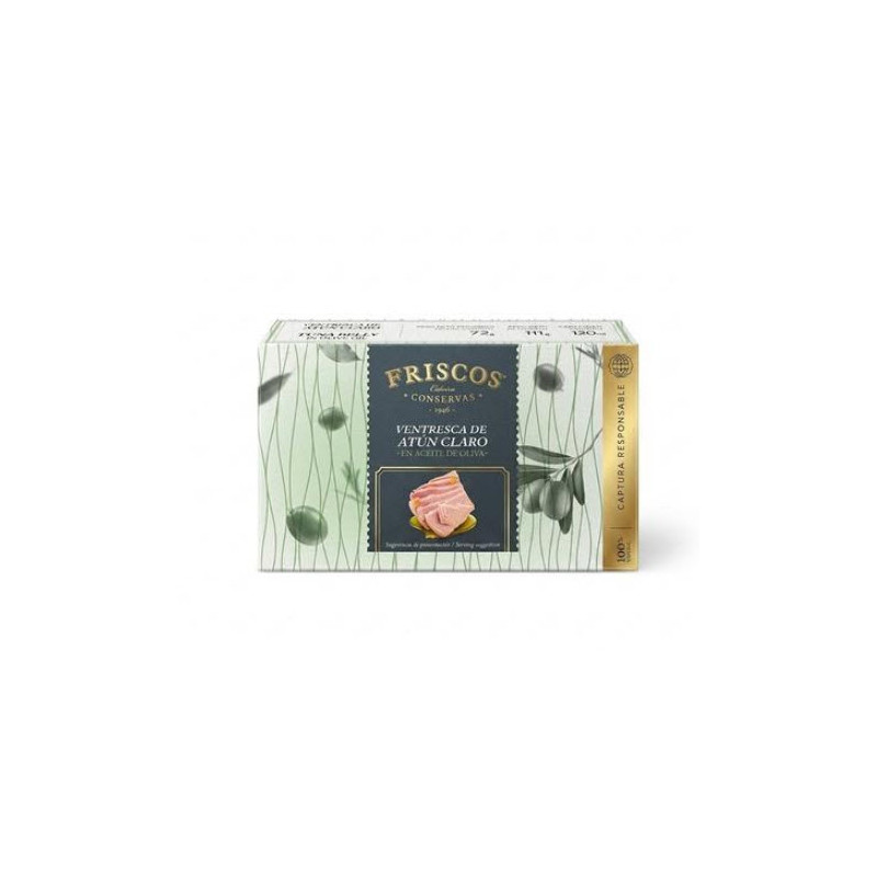 Ventresca de atún claro en aceite de oliva Friscos, presentación de 111 gramos. Se trata de la parte más jugosa y tierna del atún, elaborada con trozos enteros de ventresca. Perfecta para ensaladas, tostadas, empanadas o como aperitivo.